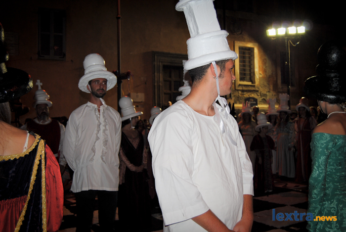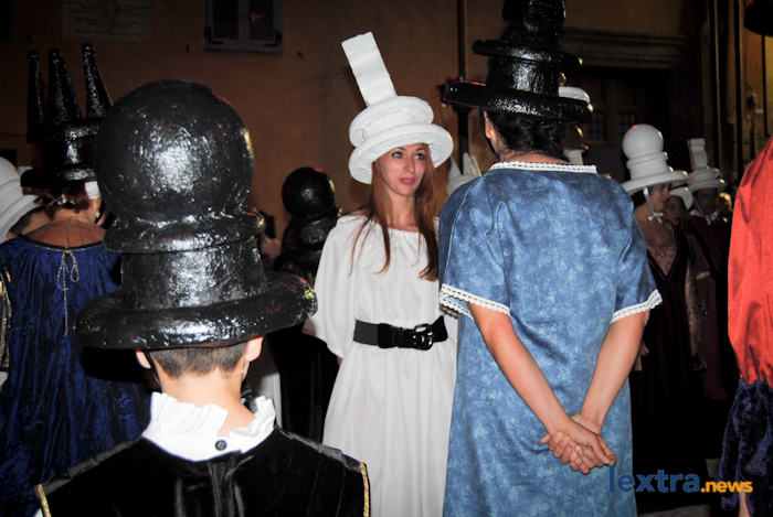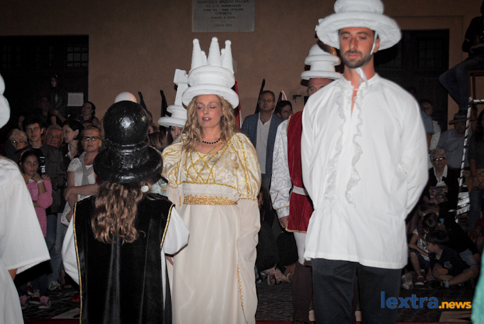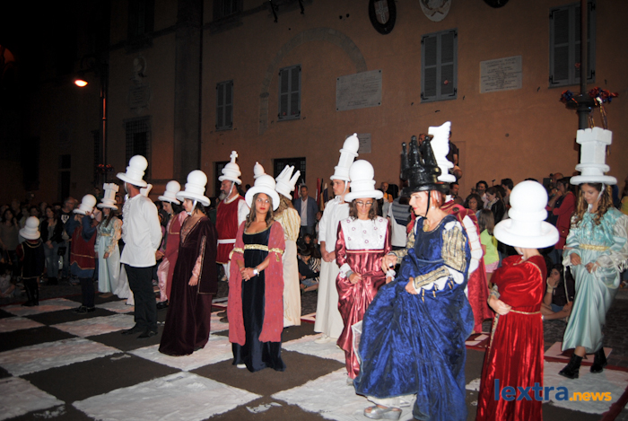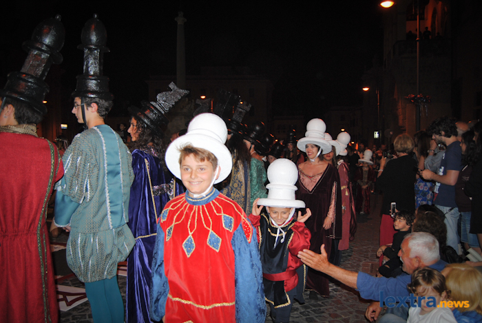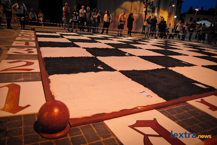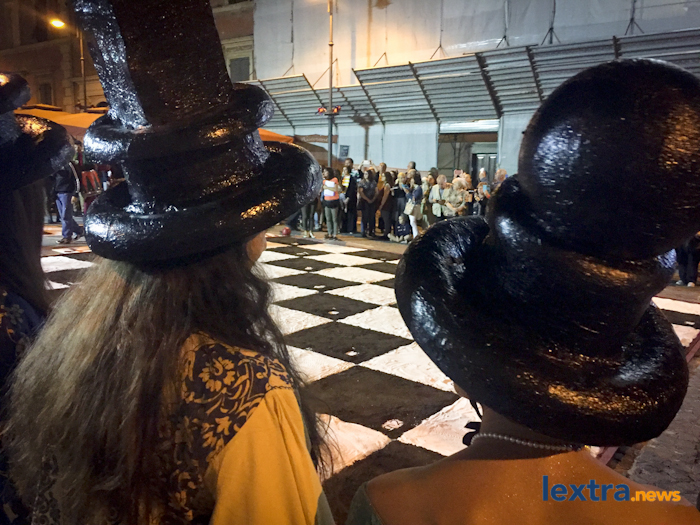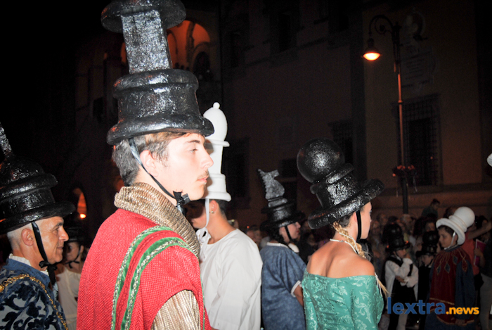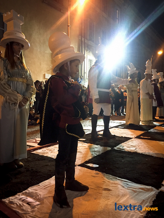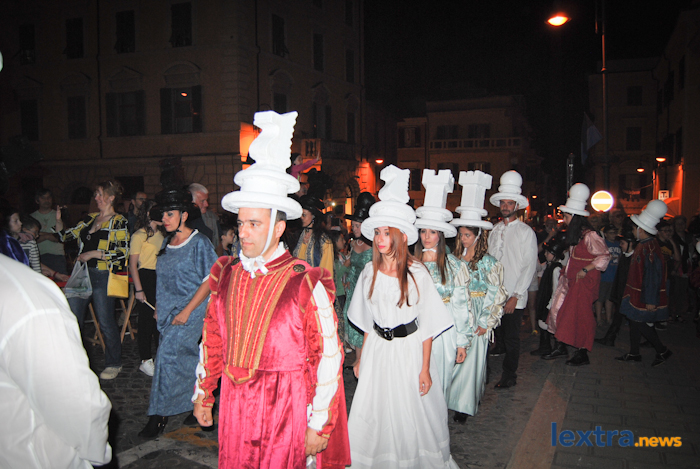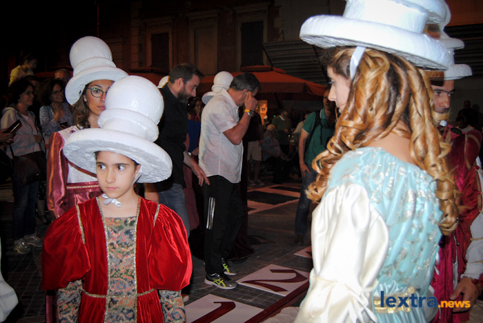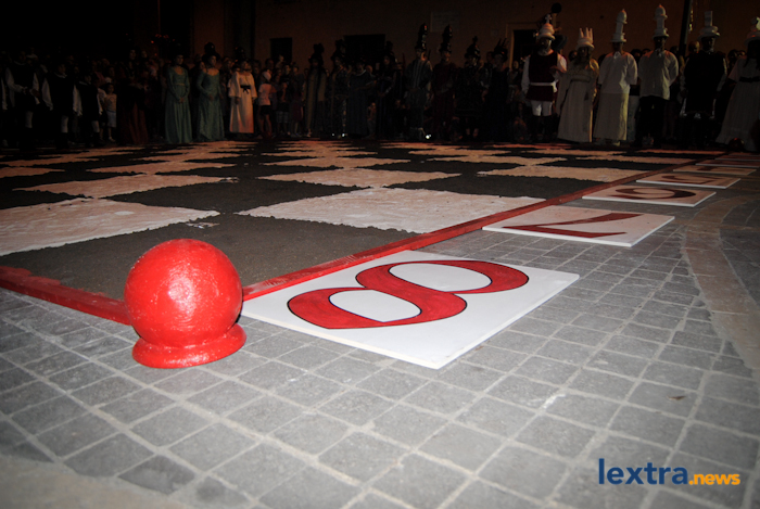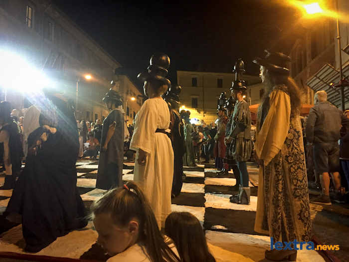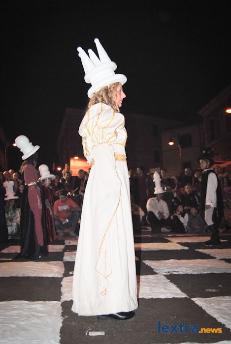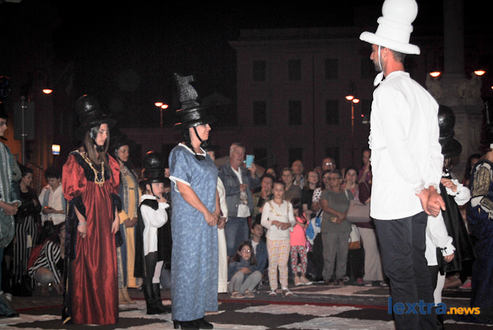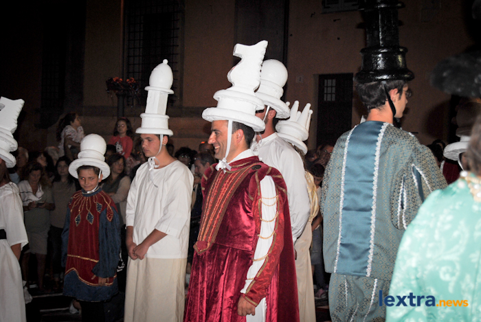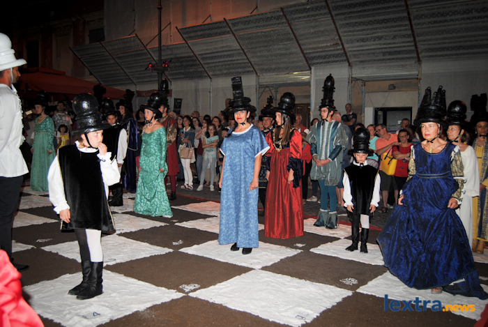 Il weekend tarquiniese della Giostra delle Contrade prosegue, in questo sabato sera, con l’inedita scacchiera vivente: mentre cresce l’attesa per il Palio di domani, si sono sfidati bianchi e neri sulla scacchiera di piazza Matteotti tra la curiosità dei presenti.