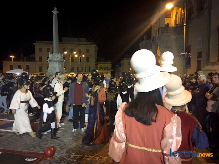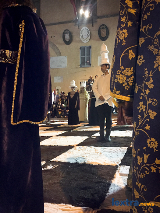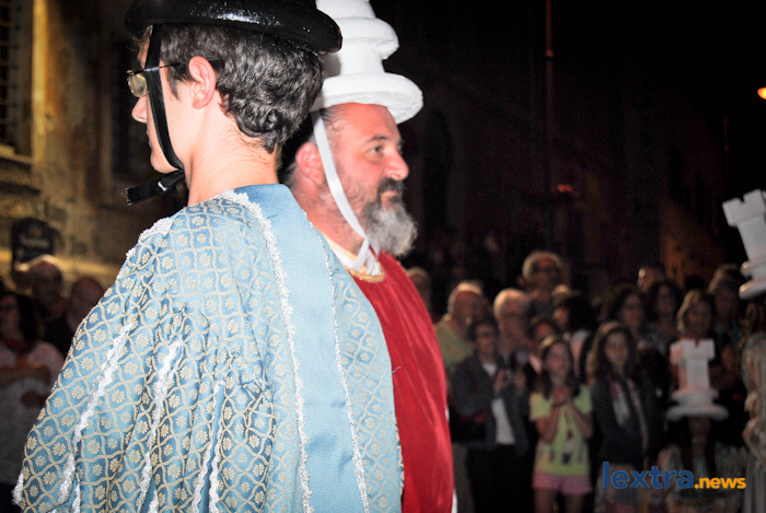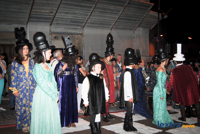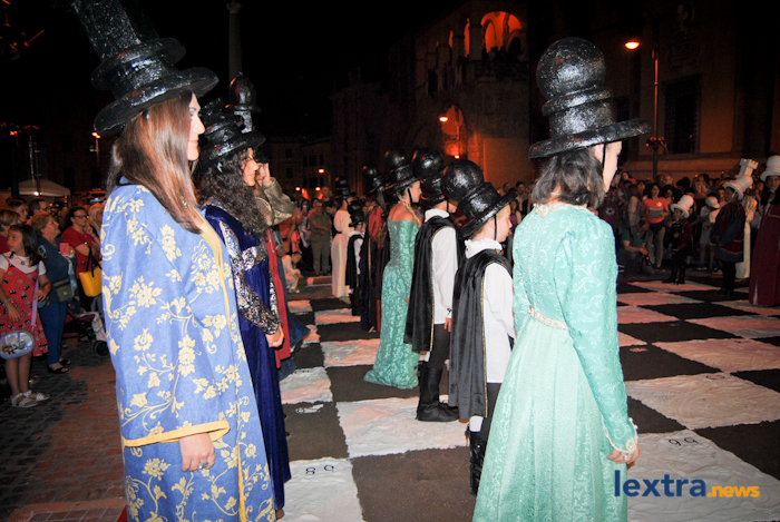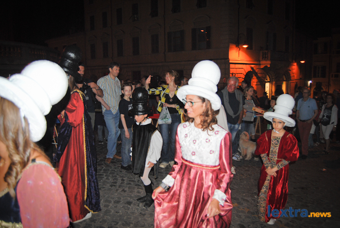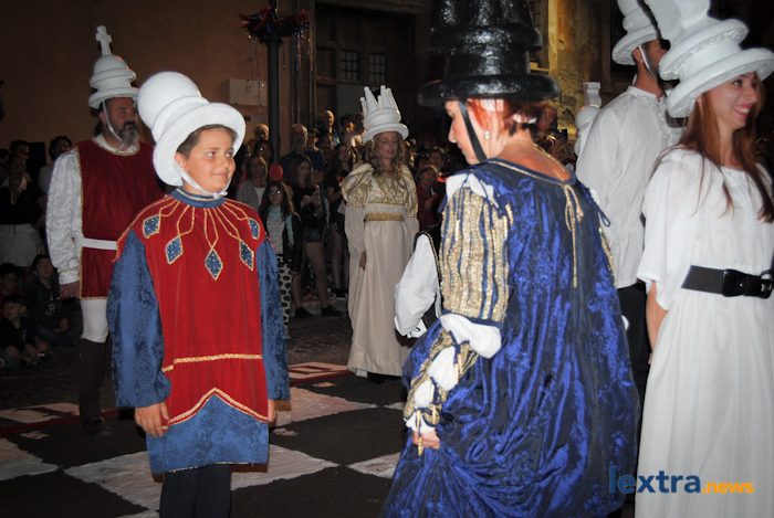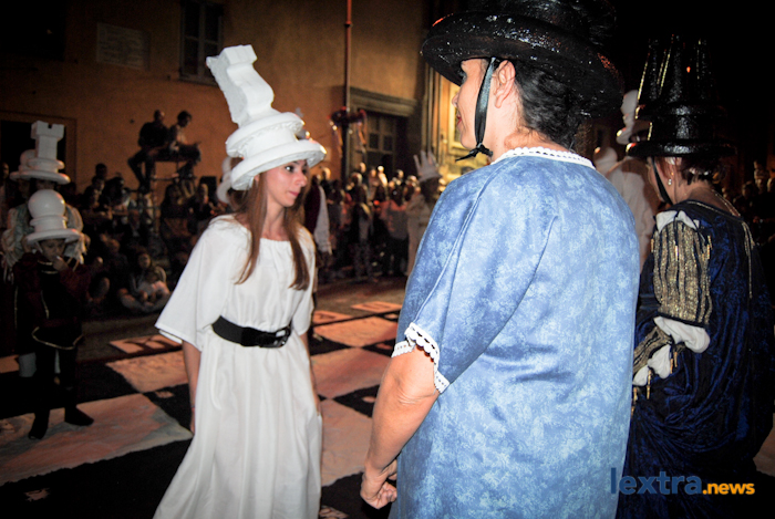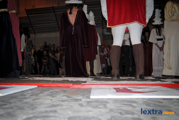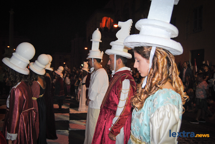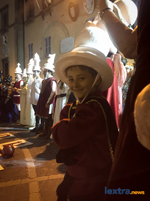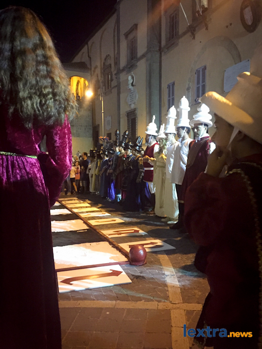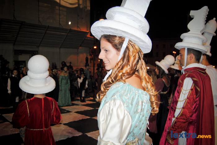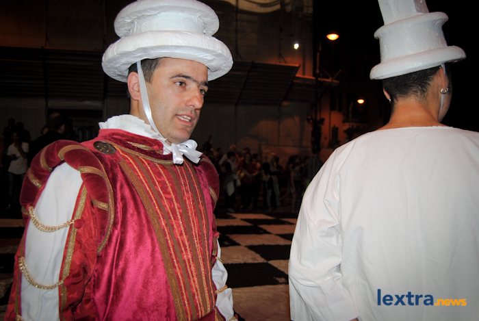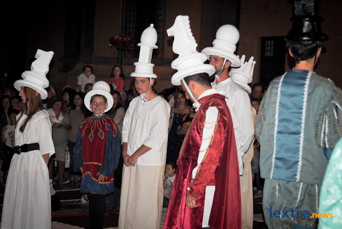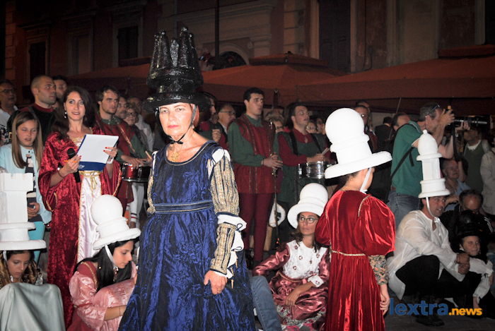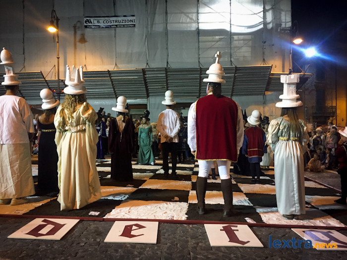 Il weekend tarquiniese della Giostra delle Contrade prosegue, in questo sabato sera, con l’inedita scacchiera vivente: mentre cresce l’attesa per il Palio di domani, si sono sfidati bianchi e neri sulla scacchiera di piazza Matteotti tra la curiosità dei presenti.