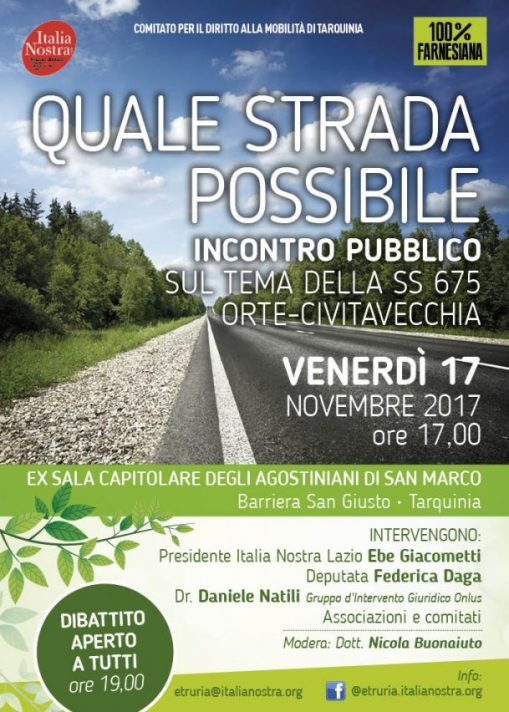Il 17 Novembre 2017, alle ore 17.00, la sezione “Etruria” dell’ Associazione Nazionale Italia Nostra Onlus e il Comitato per il diritto alla mobilità di Tarquinia organizzano un incontro pubblico sul tema della SS 675 Orte – Civitavecchia dal titolo: “Quale strada possibile” presso la ex Sala Capitolare degli Agostiniani di San Marco, barriera, San Giusto, a Tarquinia