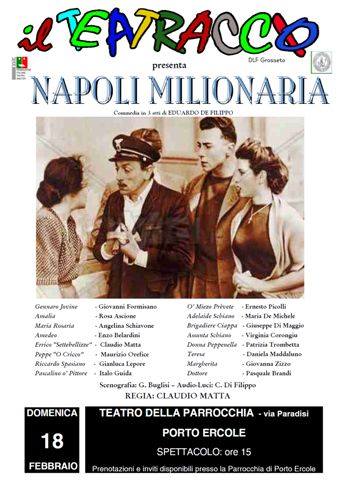 “Lo strascico di risate” che assicura la rassegna di teatro comico brillante Presi dal cacatrappole, prosegue a Porto Ercole domenica 18 febbraio. Nel teatro della parrocchia di via Paradisi arriva alle ore 15.00 la compagnia grossetana il Teatraccio DLF che per l’occasione porta in scena la commedia in tre atti di Eduardo De Filippo “Napoli Milionaria”