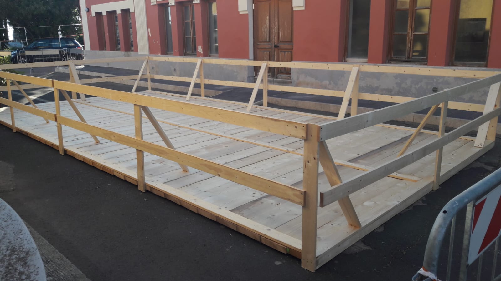 Per risolvere un problema che giace dimenticato da ben 2 anni si è pensato di costruire una pedana di legno di ampie dimensioni circondata tutt’attorno da staccionate. Un’opera che dunque né risolve il problema né rende di nuovo fruibile la strada: quale é il suo senso?