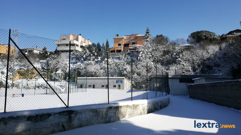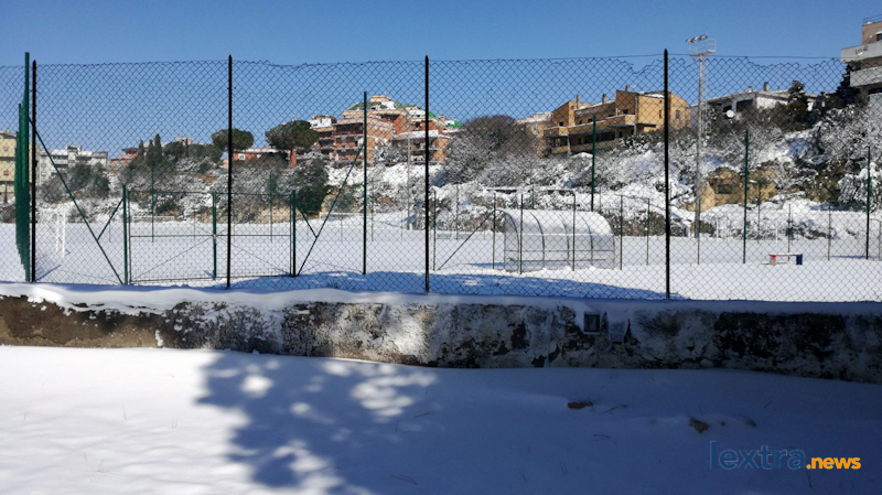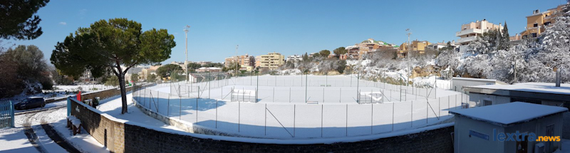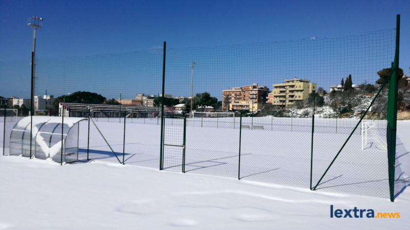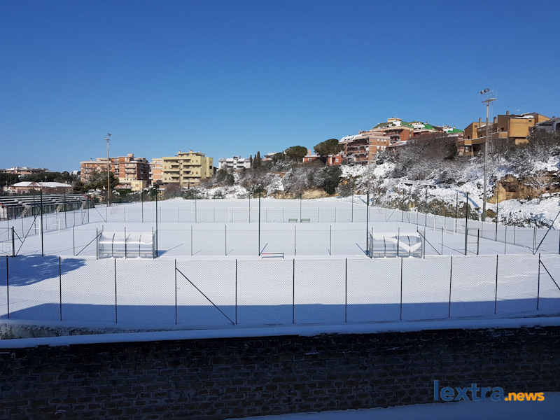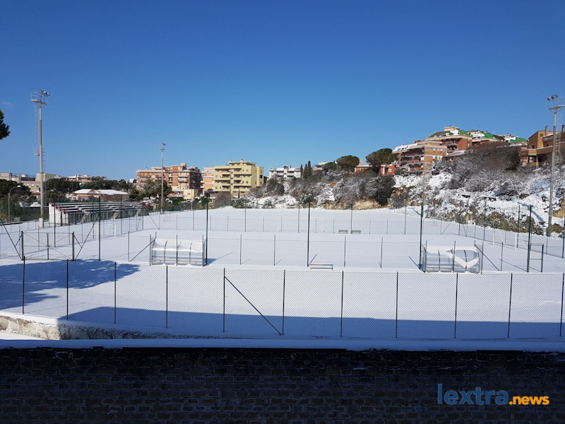 Una distesa immacolata, completamente bianca, senza che nessuno l’avesse scalfita: è lo splendido spettacolo che Massimiliano Coluccio e Fabrizio Ercolani – autori delle foto che vedete nella galleria – si sono trovati di fronte questa mattina quando sono entrati allo stadio “Cardoni”, a Tarquinia.