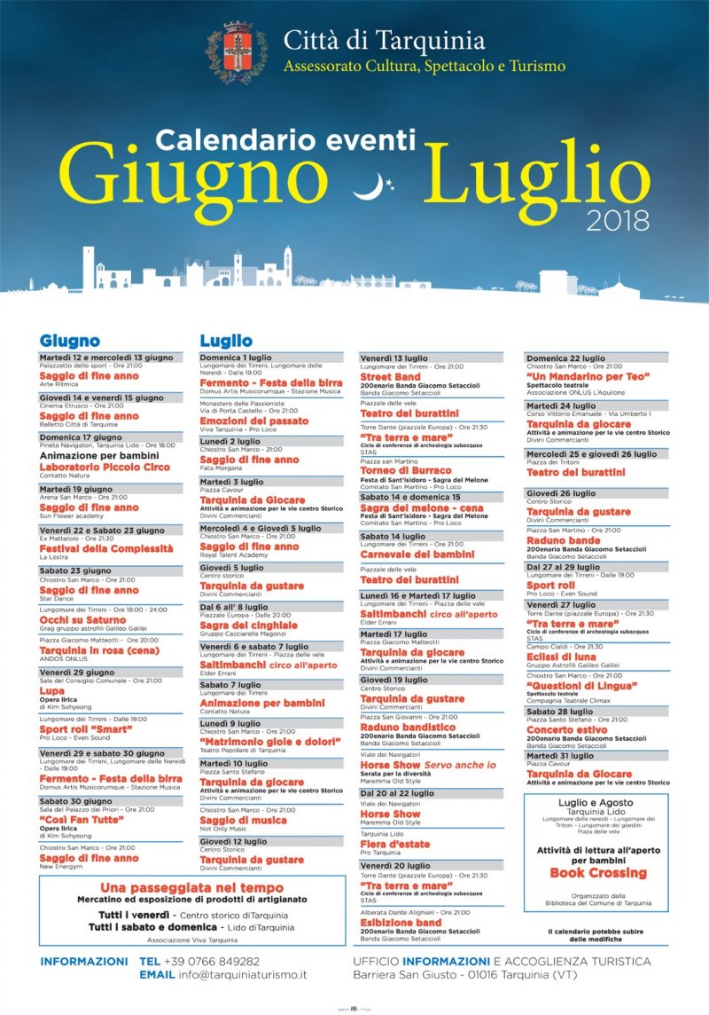 Tarquinia, reso noto il calendario degli eventi estivi di questi ultimi giorni di giugno e del mese di luglio: spiccano Fermento, la festa della birra, Sport and Roll il Carnevale dei Bambini e l’Horse Show. Qui il link per scaricarlo in alta definizione.