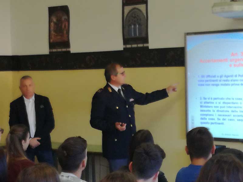 Quindi l’Ispettore Superiore “S.U.P.S.” Dott. Antonio Mancini, coadiuvato dal Sovrintendente Capo Fernando Cosimi, entrambi appartenenti all’Ufficio Posto di Fotosegnalazione – Polizia Scientifica del locale Commissariato P.S. ha iniziato la lezione che ha visto partecipare circa 130 studenti del 3°, 4° e 5° anno dell’Istituto stesso. La lezione, interessantissima, ha visto attenti gli studenti che hanno potuto ammirare le varie tipologie di intervento inerenti i diversi tipi di reato, nonché i sofisticati mezzi messi a disposizione degli agenti operanti e la professionalità con la quale ogni azione viene evidenziata ed accuratamente svolta. Stante il successo avuto in questa occasione, ci si è riproposti di effettuare un nuovo intervento in futuro. Lo scopo di tale iniziativa, ha infine dichiarato il Presidente Maurizio Paliani, è quello che ha sempre puntualizzato il Dipartimento della P.S. e cioè di continuare ad essere vicini alla gente ed alle loro quotidiane difficoltà, cercando insieme una soluzione.