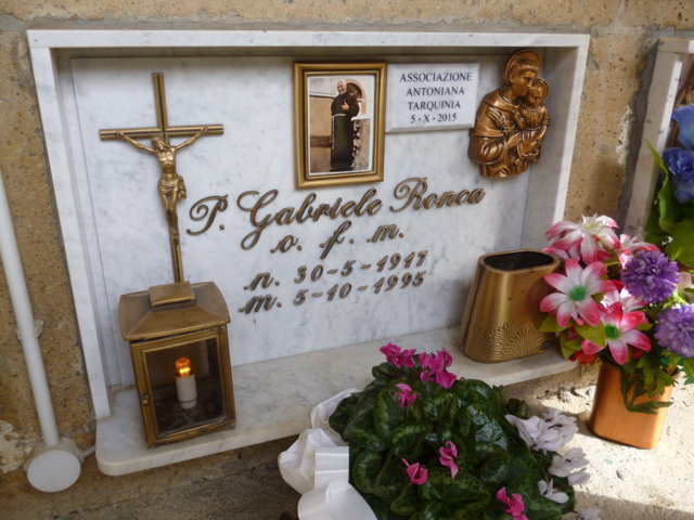 Nato a Farnese 30 maggio 1917, padre Gabriele Ronca fu ordinato sacerdote nel 1940. Dal 1947 al 1963 fu docente di lettere a Tarquinia alla scuola media parificata “Ettore Sacconi”, con sede nel convento di San Francesco. Recuperati alcuni locali in disuso, istituì un oratorio che divenne ben presto luogo di ritrovo per tantissimi giovani, anche grazie alla fondazione dell’associazione “Antoniana”. In seguito, fino al 1984, fu rettore del collegio serafico di Orte, continuando l’attività di professore. Fu poi trasferito a Viterbo, presso il convento dei frati minori, dove lavorò come bibliotecario. Si spense il 5 ottobre del 1995.