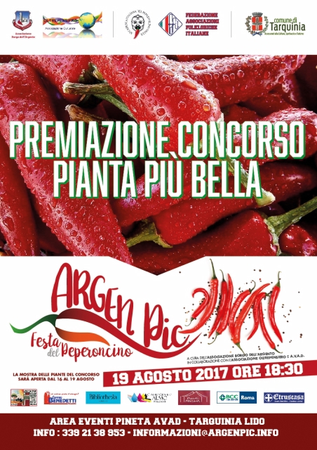 Tutto è pronto nell’Area Eventi Pineta AVAD di Tarquinia Lido (VT), sul Lungomare dei Tirreni, per ospitare la 3ª Edizione della Festa del Peperoncino ArgenPic, patrocinata dal Comune di Tarquinia (Assessorati Cultura – Spettacolo e Turismo) che dal 16 al 19 agostoanimerà i pomeriggi e le serate in una delle zone più caratteristiche del centro balneare laziale nelle vicinanze delle aree Archeologiche di Porto Clementino e del Santuario Greco ed Etrusco di Gravisca.