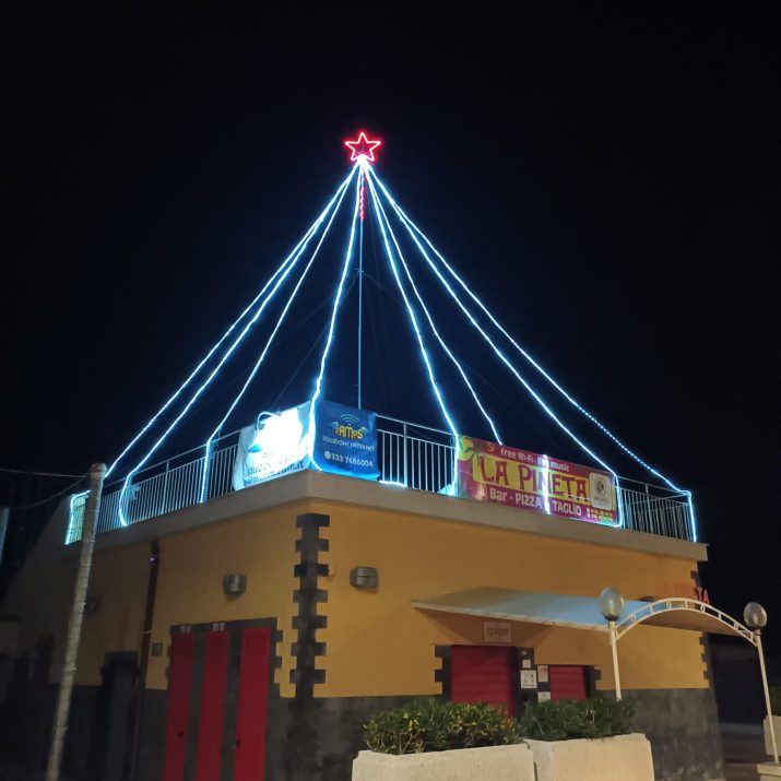 Torna anche quest’anno, come avviene ininterrottamente dal 2016, il grande albero di Natale realizzato interamente con le luci sulla terrazza dello stabilimento balneare La Pineta, a Tarquinia Lido. L’installazione, diventata ormai una consuetudine del periodo natalizio per residenti e visitatori, è frutto della collaborazione tra La Pineta e Hermes – Soluzioni Internet di Giancarlo Milioni, che ne cura l’allestimento tecnico.