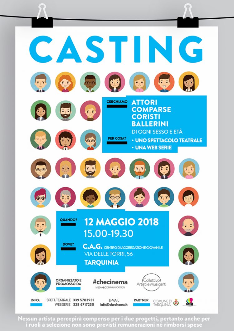 Sabato 12 maggio, a partire dalle 15 e sino alle 19 e 30, presso il C.A.G. – Centro di Aggregazione Giovanile di Tarquinia, in via delle Torri, 56 si terranno le selezioni per attori, comparse, coristi e ballerini.