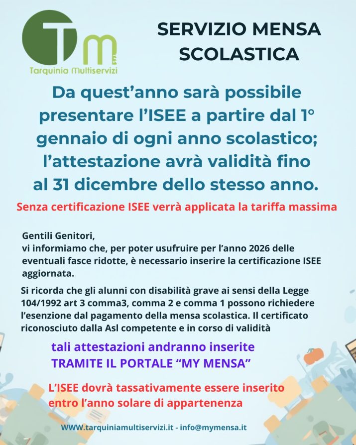 Novità per il servizio di mensa scolastica a Tarquinia. La Tarquinia Multiservizi S.r.l. comunica che da quest’anno la certificazione ISEE potrà essere presentata a partire dal 1° gennaio di ogni anno scolastico e avrà validità fino al 31 dicembre dello stesso anno.