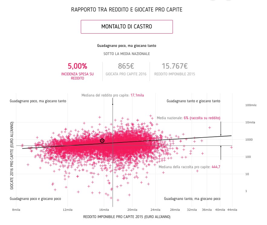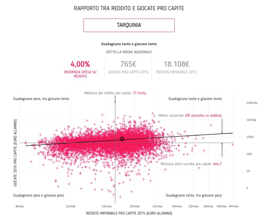 764 euro pro capite all’anno: è questa la spesa media di ciascuno dei 16.383 abitanti tarquiniesi nel 2016 in slot machine e video lottery: è quanto emerge dallo studio del Gruppo Gedi e diVisual Lab in collaborazione con Dataninja che, incrociando i dati sulla popolazione dell’Istat, quelli del Ministero sul reddito e quelli sul gioco messi a disposizione da Aams hanno creato un database interrogabile in grado di mostrare dove e quanto si gioca in oltre 7mila comuni italiani.