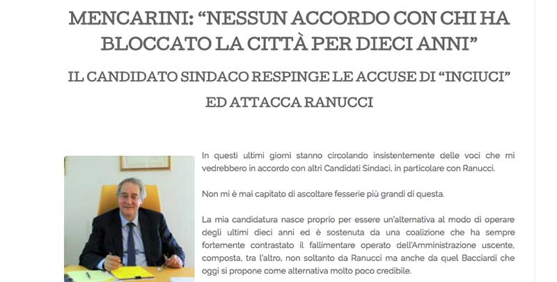 “Non mi è mai capitato di ascoltare fesserie più grandi di questa”: è categorico, in una nota affidata al proprio sito internet, il candidato sindaco Pietro Mencarini nello smentire possibili accordi con gli avversari, in particolare con Anselmo Ranucci.