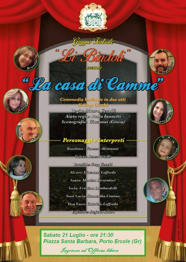 Tour estivo ricco di date in Maremma per il gruppo teatrale de Li Bindoli che sta ricevendo anche inviti a rassegne da tutta Italia. Sabato 21 luglio 2018 la compagnia che recita rigorosamente in vernacolo porterà la sua ultima commedia brillante “La casa di Camme” in piazza Santa Barbara a Porto Ercole.