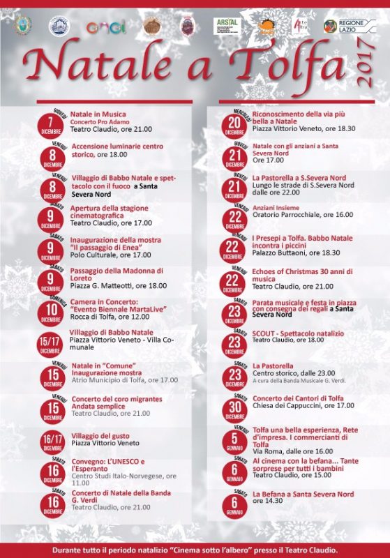 Tanta musica, tra cui un concerto innovativo “classi-rock” domenica 10 dicembre alle 12 sulla Rocca, il coro di rifugiati “Andata semplice” venerdi 15, il tradizionale “Concerto di Natale” della Verdi sabato 16 dicembre, o i 30 anni degli “Echoes” venerdi 22, tutti alle 21. Senz’altro da non perdere l’appuntamento tradizionale più atteso, quello della Pastorella la notte del 21 a Santa Severa e il 23 a Tolfa. Tra le altre cose una mostra iconografica al Polo Culturale dal titolo “Il passaggio di Enea”, un convegno internazionale sabato 16 con la partecipazione degli Ambasciatori di Norvegia e Polonia e grande festa per l’Epifania con la festa organizzata dai commercianti di Tolfa il 5 e al Claudio il 6 gennaio. Inoltre da sabato 9 dicembre ripartirà l’attività cinematografica, sempre al Claudio.