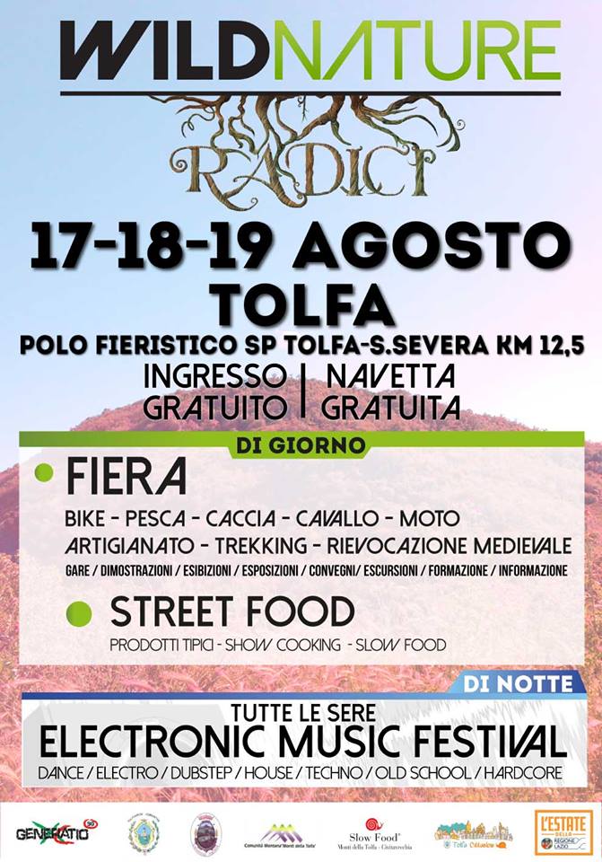 Il Wild Nature, evento socio ambientale che si terrà a Tolfa dal 17 al 19 agosto, scalda i motori. L’iniziativa, giunta quest’anno alla sua settima edizione, è stata completamente rinnovata rispetto al passato, con lo sviluppo di un’idea di “villaggio” della durata di 3 giorni. Presso il Polo Fieristico in loc. Nocchia (strada provinciale Tolfa – Santa Severa) saranno presenti espositori di prodotti tipici, associazioni e operatori legati allo sviluppo del territorio, ristoratori che si esibiranno e sfideranno in attività di Show cooking facendoci assaporare le prelibatezze locali, mercato a Km0, associazioni per la promozione del Cavallo Tolfetano, artigiani del cuoio, esibizioni canine, equestri, primi approcci con la pesca e con il mondo venatorio e molto altro. Il tutto accompagnato dalle performance unplugged di ballerini e dei migliori artisti italiani ed internazionali, professionisti e dilettanti, accompagnando il pubblico dal pomeriggio a notte inoltrata.