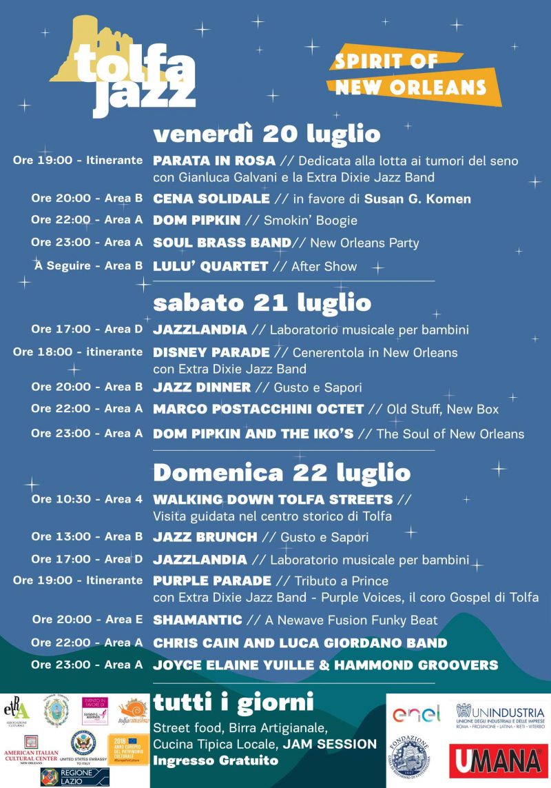 Il Tolfa Jazz 2018 si apre venerdì 20 luglio alle 19.00 con la “Parata in Rosa” per la lotta ai tumori del seno che il Festival sostiene dal 2016 come partner di Susan G.Komen Italia. Con musica, balli e colori si ricreerà l’atmosfera del Mardi Gras neworleansiano. Fino a domenica 22 luglio, per tre giorni consecutivi di festa gratuita e aperta a tutti, la città di Tolfa sarà invasa dallo “Spirit of New Orleans”. Questa IX edizione è dedicata ai trecento anni dalla fondazione di New Orleans (1718-2018), con un programma ricco e vario cui fa da sfondo il borgo medievale con le sue case in pietra locale abbracciate al monte della Rocca, raccolte sotto i ruderi del Castello. Nel clima vivace e popolare che caratterizza il Tolfa Jazz, ogni vicolo e ogni piazza risuoneranno di musica e si animerà di attrattive in un continuo intrecciarsi di innovazione e tradizione, e si trasformerà in un fervido crocevia di artisti. Musicisti provenienti da tutto il mondo renderanno omaggio alle sonorità della città americana, dalle origini passando per la sua epoca d’oro, fino alla modernità: dal blues al dixieland, fino ad arrivare al funk e al soul. Tra gli ospiti internazionali Dom Pipkin (UK), la Soul Brass Band (New Orleans), Chris Cain (California) e Joyce Elaine Yuille (New York).