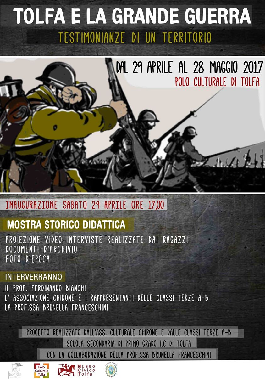 Sabato 29 aprile alle ore 17,00 presso il Polo Culturale di Tolfa si terrà l’inaugurazione della mostra storico – didattica: “Tolfa e la Grande Guerra. Testimonianze di un territorio”. La mostra rappresenta la fase finale di un lungo lavoro, durato tutto l’inverno, in cui gli studenti delle classi terze medie dell’Istituto comprensivo di Tolfa, coordinati dall’Associazione culturale Chirone e dalla Prof.ssa Brunella Franceschini, hanno portato a termine una stimolante ricerca tra ricordi familiari e documenti d’archivio inerenti il periodo della Prima Guerra mondiale.