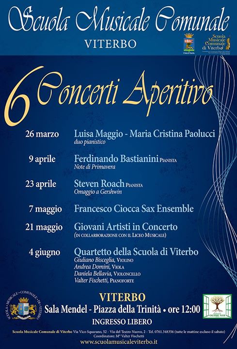 Al via i Concerti Aperitivo alla Trinità. Domenica 26 marzo alle 12, alla Sala Mendel (chiostro della Trinità), inizierà un ciclo di sei concerti promossi dalla Scuola Musicale Comunale. Avranno una cadenza quindicinale e termineranno il 4 giugno. Vi sarà l’opportunità di ascoltare pagine di musica davvero straordinarie, tra cui la Rapsodia Spagnola di Ravel (duo Maggio-Paolucci), il Quartetto il sol minore di Mozart (Quartetto della Scuola di Viterbo), e la Rapsody in blue di Gershwin eseguita dal meraviglioso pianista americano Steven Roach. Momenti di grande divertimento con le Note di Primavera offerte da Ferdinando Bastianini, e con il piacevolissimo Francesco Ciocca Sax Ensemble, a ritmo di jazz. Un concerto sarà dedicato a giovani talenti, scelti tra gli allievi della Scuola Comunale che del Liceo Musicale. Ingresso libero.
