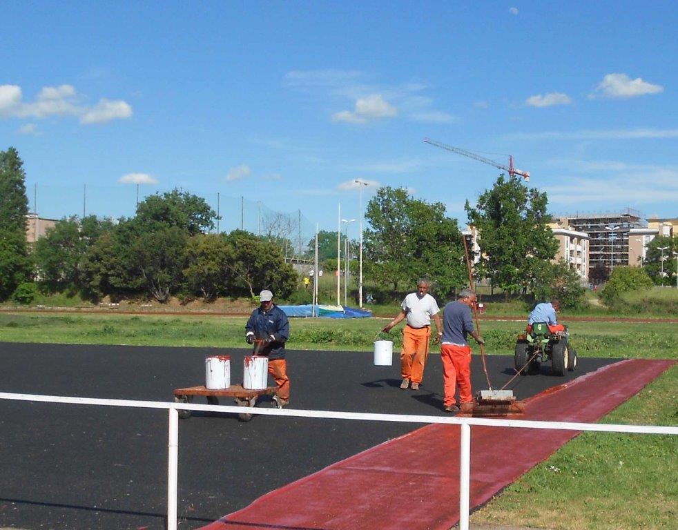 Dopo la stesura del primo strato di manto gommoso, si sta passando in questi giorni alla prima stuccatura colorata per poi passare nei prossimi giorni alla posa degli ultimi due strati definitivi. Sarà la stessa ditta dei f.lli Anastasi ad eseguire la delicatissima segnatura delle linee che delimiteranno le corsie ed anche tutte le linee di partenza delle varie gare previste e le distanze per le gare di corsa ad ostacoli, che consentiranno in seguito l’omologazione dell’Impianto da parte della FIDAL.