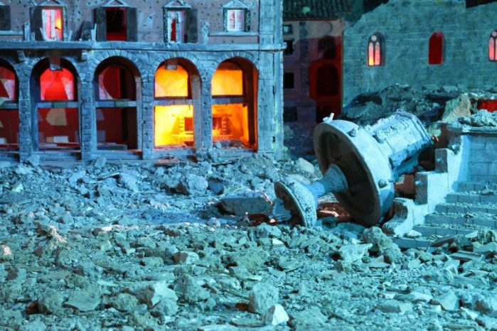 La spettacolare ricostruzione occupa una superficie di oltre 20 metri quadrati e ricostruisce in miniatura la bellissima piazza della Rocca durante i bombardamenti.