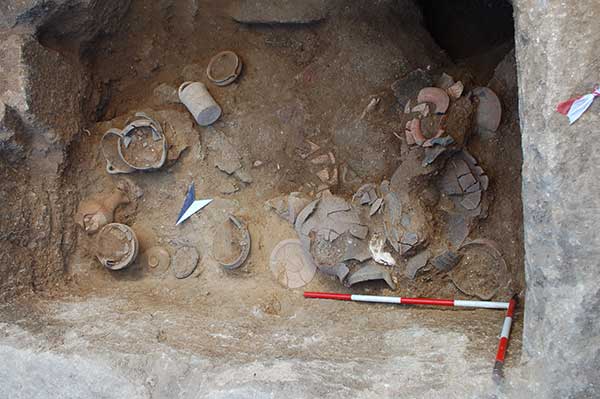 Nella giornata di oggi è avvenuto il ritrovamento di una fossa scavata nel tufo con più di 30 oggetti, ed in particolare alcuni anelli in argento insieme a numerosi oggetti in bronzo (fibule, affibbiagli, immanicature, vasi) risalenti alla fine dell’VIII/inizi VII a.C. A fianco dell’importante tomba è stata ritrovata la sepoltura di una bambina, sepolta in una nicchia.