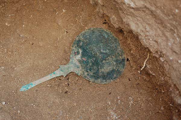 Al suo interno una serie di ornamenti personali, probabilmente indossati al momento della sepoltura:  due coppie di orecchini d’oro e un anellino d’argento, mentre due statuine in bronzo a forme di sirena (forse piedini di una situla anch’essa bronzea) completavano il corredo. A lato,  parzialmente sconvolti da un intervento clandestino recente,  emergono i resti di altre due sepolture sempre di fine IV-inizi III sec. a.C., tra cui fa bella mostra di se uno specchio in bronzo in mezzo ad altri oggetti di metallo quali anellini, vasi, asce e lame, ed un servizio di vasi alcuni dei quali dipinti.